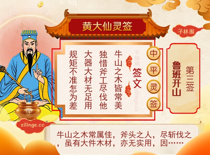 黄大仙灵签第三签:鲁班开山 (中平灵签) 牛山之木常属佳斧头之人尽斩伐之虽有大件木材亦无实用因此木不合规矩难以做木筏之用也求此签者宜将一切不良嗜好均要节戒勿为小人攻伐其短处要循规蹈矩今所行不善不依规矩终归无用真可惜矣此吉中而有凶凡得此签须要防范小人侵害。 黄大仙灵签第三签签诗: 牛山之木皆常美。独惜斧工尽伐他。 大器大材无足用。规矩不准怎为差。 黄大仙灵签第三签仙机: 名与利。依理求。 蚕与婚。莫妄求。 病慎医。免祸愁。 问家宅。德宜修。 行未至。孕有忧。 凡谋事。勿贪求。