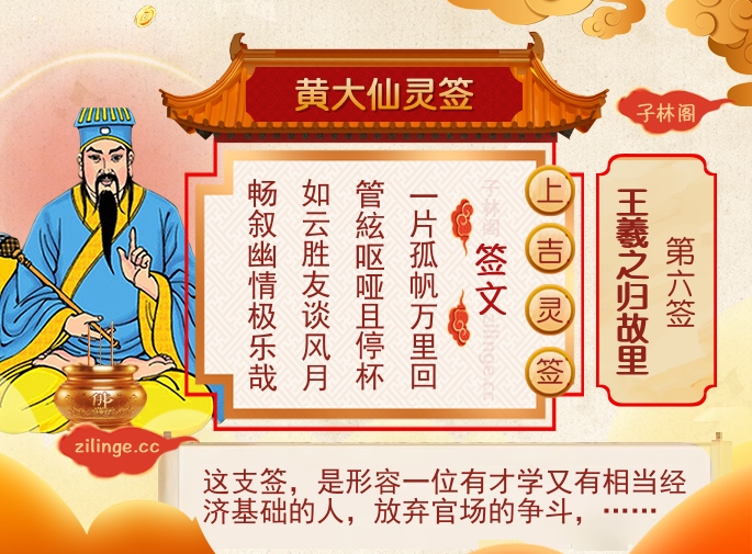 黄大仙灵签第六签:王羲之归故里 (上吉灵签) 这支签是形容一位有才学又有相当经济基础的人放弃官场的争斗急流勇退毅然返故乡一方面得聚天伦及友谊之乐优哉悠哉一方面又可以继续发展自己的专长扬名于后世。 黄大仙灵签第六签签诗: 一片孤帆万里回。管絃呕哑且停杯。 如云胜友谈风月。畅叙幽情极乐哉。 黄大仙灵签第六签仙机: 蚕有利。名必成。 行人至。家宅兴。 病即愈。财即盈。 六畜吉。婚姻成。 若六甲。贵子生。 问谋望。百事亨。