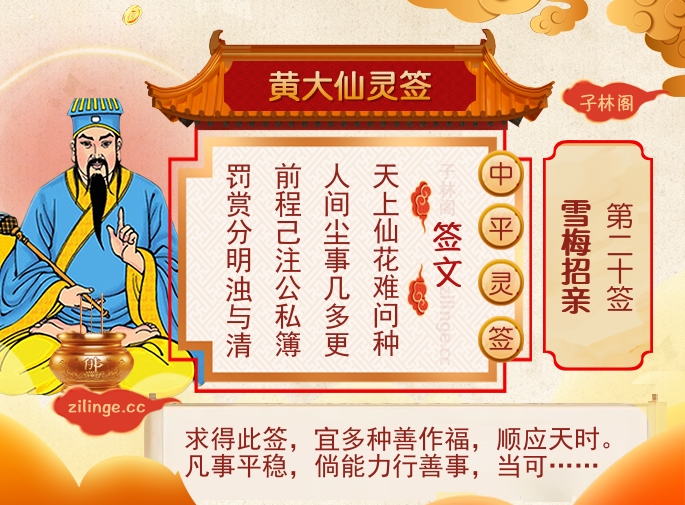 黄大仙灵签第二十签:雪梅招亲 (中平灵签) 求得此签宜多种善作福顺应天时。凡事平稳倘能力行善事当可获福也。 黄大仙灵签第二十签签诗: 天上仙花难问种。人间尘事几多更。 前程己注公私簿。罚赏分明浊与清。(己同已) 黄大仙灵签第二十签仙机: 名与利。附之命。 病审医。婚未定。 宅平安。要修省。 孕与蚕。作福吉。 行欲归。难定日。 若谋望。修善得。