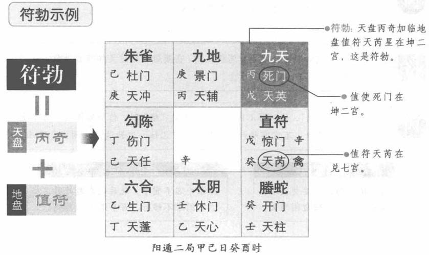 【原文】 丙加天乙为符勃,天乙加丙为飞勃。 【原注】 汤谓曰:“天上六丙,加地下当年、月、日、时干者,勃。勃者,乱也。天上六丙,临年、月、日、时干,值符类同,六丙所加之义也。凡举事用兵遇勃,主纲纪紊乱也。” 假令冬至中元阳遁七局,丁壬之日,日昳丁未时,此时六丙在五宫,寄在二宫,以值符天芮加时干六丁于四宫,即六丙临六丁于四宫,此名时勃也。右凡遇六丙、六庚之为,值符加时干,则十时皆为勃格,四时审而用之。 【白话提要】 勃的意思是勃乱逆反。当天盘上的六丙加临地盘值符时,为“符勃”;当天盘值符加临地盘丙奇时,为“飞勃”。比如小寒上元阳遁二局,甲、己日,癸酉时, 符勃和飞勃示例 勃格有符勃和飞勃两种形式,下面就通过示例来说明其具体的形式,遇到此两格,一看四季都必须留意。 天芮为值符,时干在兑七宫,天盘天芮星加兑七宫,天盘丙奇下临坤二宫值符天芮星,就是符勃。又如大暑下元阴遁四局,丁、壬日,丙午时,值符为天英,加乾六宫丙奇之上,就是飞勃。 总之,凡是遇到天盘六丙或六庚加临地盘的时干上,则在相应的时辰里都是“勃格”现象,一年四季里都必须留意。 |