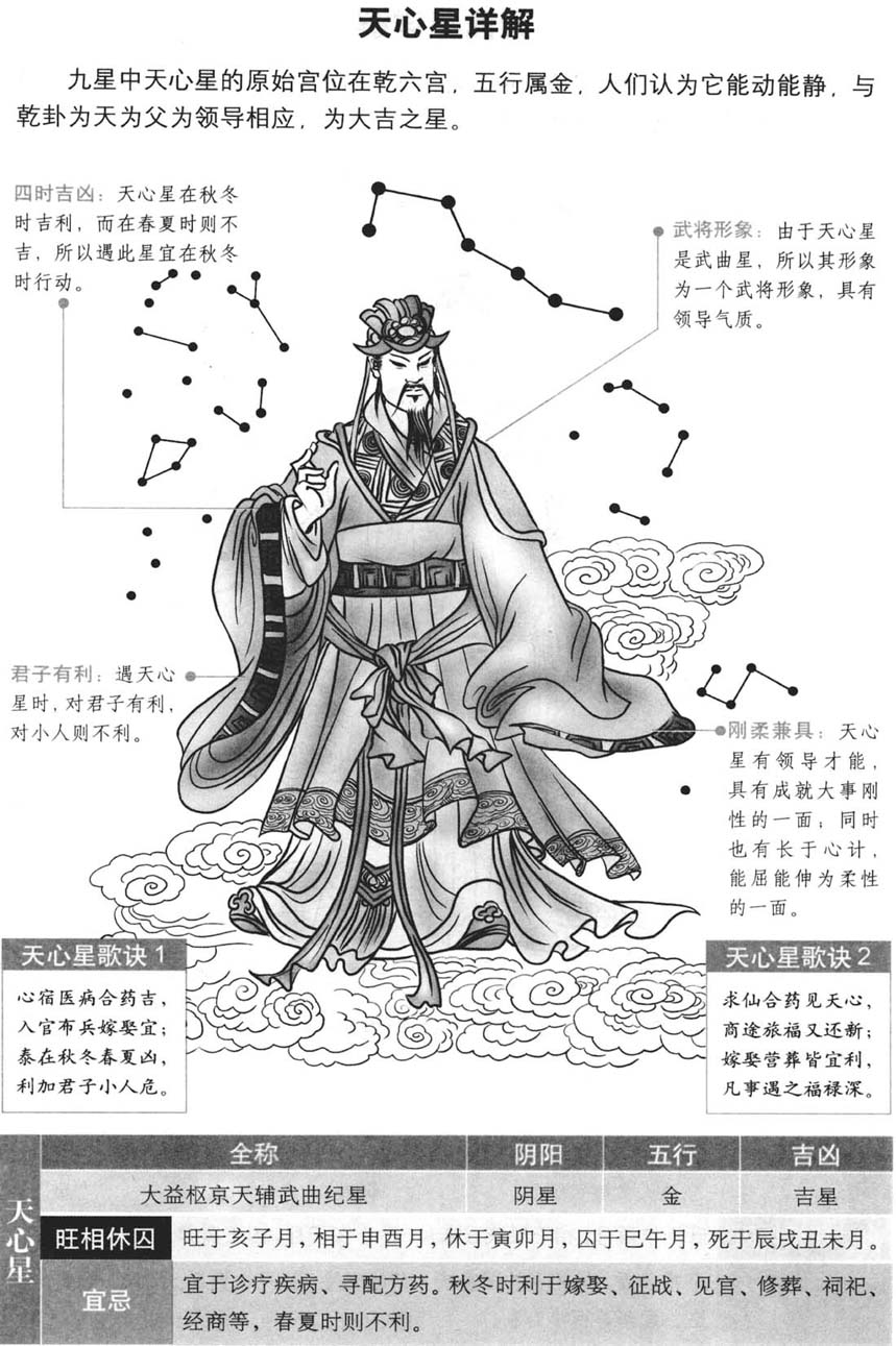 天心星为大吉之星,古人认为它能动能静,与乾卦为天为父为首长相应,长于心计,和领导才能、军事指挥、医疗治病有关,故称为大吉之星.