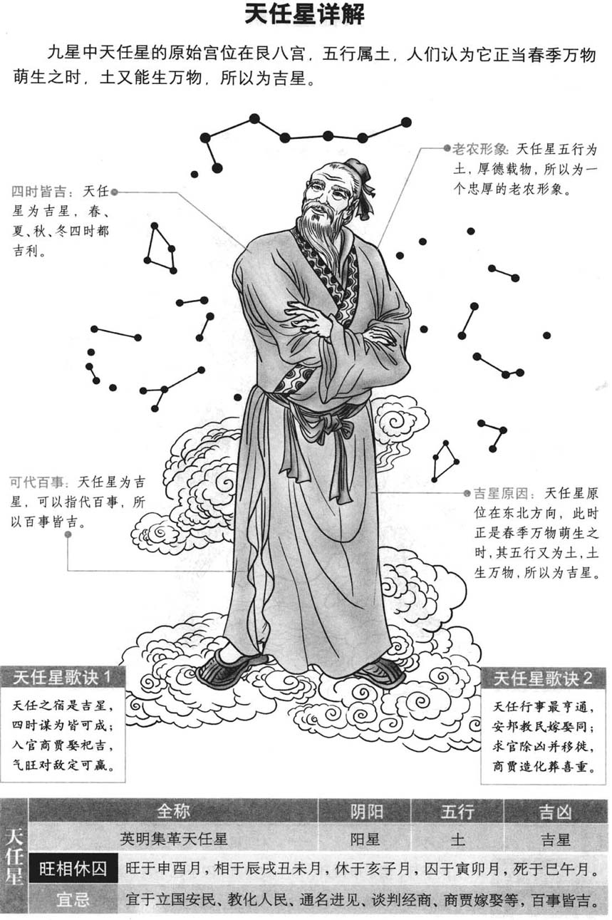 : 以下是对奇门遁甲中九星之天任星的详细介绍:基本信息原名:左辅星.对应宫位:东北艮八宫.五行属性:土,性质属阳性.旺相休囚旺于秋,相于四季月,休于冬,囚于春,废于夏.吉凶属性天任星为吉星,古人认为土能生万物 ...