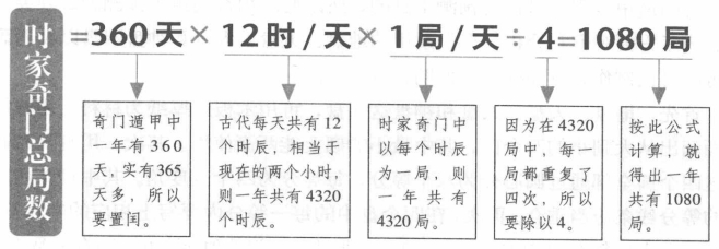 按照上面所讲的奇门遁甲排布方法,一年有360天,一天有12个时辰,一个时辰一个格局,则时家奇门的总局数是4320局。但在这4320局中,实际上每一局都重复了四次。比如阳遁一局包括冬至上元、惊蛰上元、清明中元、立夏中元,这四元共二十天,按每个时辰一个格局计算,共有240局,而其实却只有60个格局。其他格局也无不如此,都是重复了四次,所以最后就是1080局。