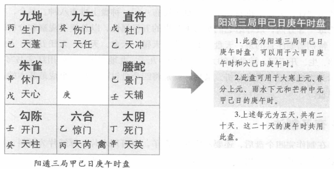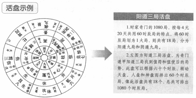 在时家奇门的1080的定局中,还可以用活盘演示,每个活盘可演示从甲子到癸亥60个时辰的格局。按此计算,这1080局就可以用18个活盘来演示全年所有进辰的格局。这18个活盘就是阳遁九局和阴遁九局,其中阳遁九局活盘共有540个时辰定盘,阴遁九局活盘也有540个时辰定盘,合起来正好是1080局定盘。因为时家奇门中共有1080个盘,这1080个盘是固定的,可以通过烦琐的排布而全部排定。所以在具体的预测中,可以不用一步步去排布,而是直接用时辰来对应其1080局,本书后面的内容就将排定这1080局,以备查找,而不用再一步步去排盘。