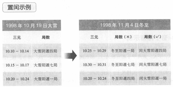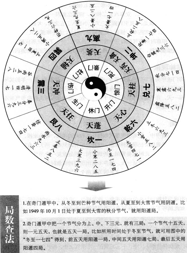二至分顺逆 确定了预测的时间后,就要据此来确定局数。首先就是要分阳遁局和阴遁局其方法是:用事的时间在冬至以后的,用“阳遁顺局”;用事的时间在夏至以后的,用“阴遁逆局”。用阳遁局的节气是:冬至、小寒、大寒、立春、雨水、惊蛰、春分、清明、谷雨、立夏、小满、芒种。用阴遁局的节气是:夏至、小暑、大暑、立秋、处暑、白露、秋分、寒露、霜降、立冬、小雪、大雪。 节气定三元 阴阳遁各有九局,共十八局,在确定了是阴遁局还是阳遁局后,就要确定其具体的局数。这就要用所用时间的节气来确定三元,以此来确定其具体的局数。年有二十四节气,那么每月就有两个节气,每个节气又有三候,一候即一元,则一个节气就有上、中、下三元。每一元分管五天,每个节气分管十五天。用事之日属于哪一节气,一般可从历书中查得,用事之日属于哪一元,则要用这一日的干支去查对六十甲子。六十甲子按五天一元来计算,可得到十二个符头,即甲子、己巳,甲戌、已卯,甲申、已丑,甲午、已亥,甲辰、已酉,甲寅、已未。其中凡属甲子、已卯和甲午、已酉四个符头统领的干支,为上元,凡属已巳、甲申和己亥、甲寅四个符头统领的干支,为中元,凡属甲戌、已丑和甲辰、已未四个符头统领的干支,为下元。 阴阳遁局数 奇门遁甲排盘在定时后,就要确定其阴阳遁的局数,其方法是根据节气三元来确定,具体可参照下图,直接查得即可。 起宫歌诀 在确定了三元后,就可以确定其局数,具体可用下面的两首歌诀。阳遁顺局起局歌诀是:“冬至惊蛰一七四,小寒二八五相随,大寒春分三九六,芒种六三九是仪,谷雨小满五二八,立春八五二相宜,清明立夏四一七,雨水九六三为期。阴遁逆局起局歌诀是:“夏至白露九三六,小暑八二五之间,大暑秋分七一四,霜降小雪五八二,大雪四本一相关,处暑排来一四七,立冬寒露六九三。”这两首歌诀说的是,用事时间节气后的三个数字,代表着上、中、下三元所应起之宫位,比如冬至或惊蛰节气,上元用阳遁一局,中元用阳遁七局,下元用阳四局。 超神现象 奇门遁甲关于节气三元的划分,是按一年360天来计算的,但一年的实际时间却是365.2422日,每个节气平均为15.2148日,不是正好十五天,这样每个节气交节的那一天,并不能都与符头的日干碰到一起,就会出现符头跑在节气前边的现象,称为“超神” 置闰 在奇门遁甲中,先是出现节气和符头正相对的现象,称为正授,但这种情况不是太多。接着便会出现超神现象。这种差距有时只有一两天,有时四五天,最多可达九天以上,此时就要置闰。所谓置闰,就是重复一个节气,即把某个节气的上、中、下三元再重复一次。但并不是出现超神现象时就置闰,只有在芒种和大雪这两个节气时才能置闰,这是因为这两个节气恰好在冬至和夏至之前,在二至之前的节气置闰,就是在阴阳遁开始之前把符头调整好,使头和节气尽量接近,而不致超过得过多。如果在别的节气置闰,就容易使阴阳混淆。经过置闰后,又会出现节气跑到符头前面的现象,称为接气。但经过一段时间后,又会出现正授,如此循环下去,从此保证奇门遁甲预测的准确性。 不置闰 也有少数人不主张置闰,但为了解决超神现象,主要有两种方法。一种是拆补法,此法仍然把上、中、下三元放在一个节气之中,而且仍采用三元的确定方法,但由于多数情况下是超神,所以从交节以后所用上元天数必然不满五天,这就叫拆。到了交下一个节气之前,用完下元之后,一般还有两三天可以用来补上元所缺的天数,这就叫补。还有一种方法是,直接从每个节气的交节时开始,即用本节气遁甲上元局,上元用满六十个时辰转入中元,中元用满六十个时辰转入下元。这样就打破了根据日干支符头确定三元的规律。而且还会出现遁甲下元有所取舍的情况,即前一个节气下元尚未用完六十个时辰,节气一到就停止不用,即要舍弃一部分时间,前一个节气下元已用完六十个时辰,下个节气尚未到,仍需继续用前一个节气下元,这就叫做取。 超神的解决方法 上面所讲的阴阳遁局数的查找方法并不是万能的,中间会出现超神现象致使奇门遁甲的预测出现误差,下面就讲解几种解决方法。 |