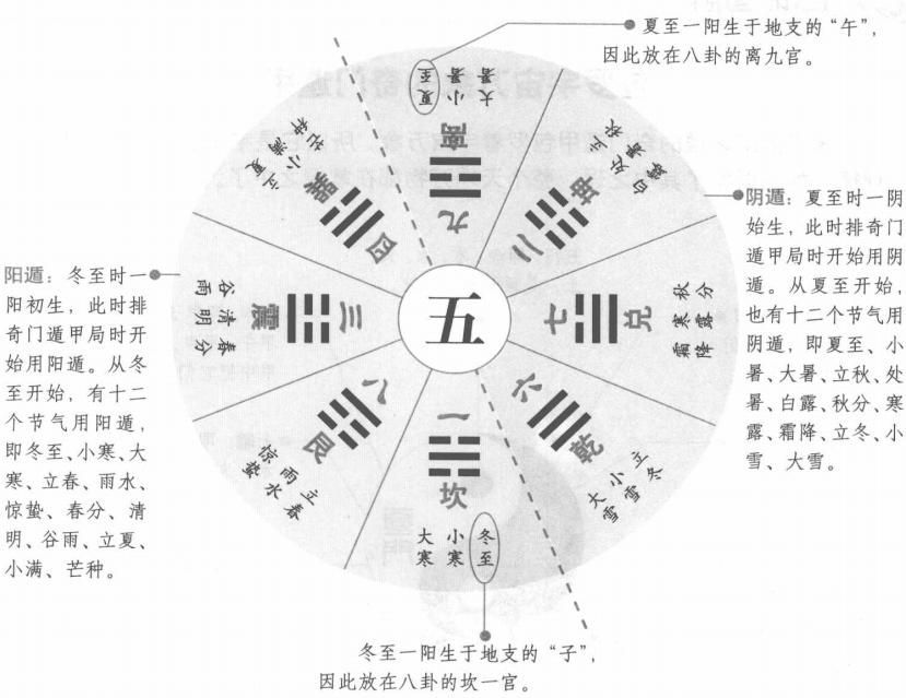 奇门遁甲分为阳遁和阴遁两种,这两种的划分是冬至后为阳遁,夏至后为阴遁。下面就用图来说明。