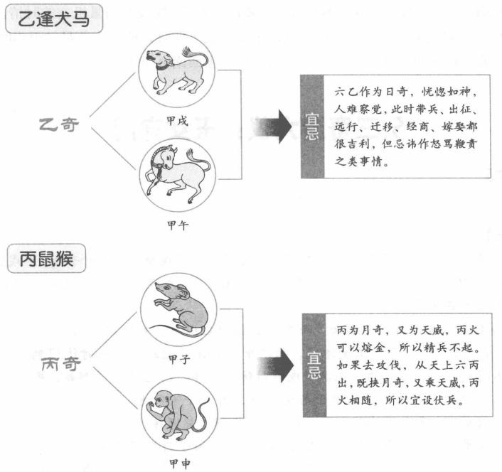 乙奇加甲午为马,加甲戌逢犬也。丙奇加甲子为鼠,加甲申为猴。丁奇加甲辰为龙,加甲寅为虎。谓三奇得使,最为吉也。