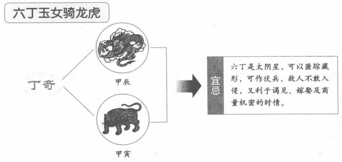 六丁,在天干中居阴,又是甲的女儿,所以称六丁的代号为玉女,古人认为六丁是三奇之中最具灵性的,神出鬼没,履险如夷,凡出入、用兵、作战都可以靠它来取得吉利。六丁是丁卯、丁丑、丁亥、丁酉、丁未、丁巳,是六甲的阴护之神,天盘丁奇会地盘的甲辰、甲寅,为六丁骑龙、骑虎之象。六丁是太阴星,可以匿踪藏形,可作伏兵,敌人不敢入侵,又利于谒见、嫁娶及商量机密的时情。例如立夏下元阳遁第七局,甲、己之日,甲子时或丁卯时,值符天芮星转至当时的天干之宫,则可见六丁下临二宫,二宫为坤,主西南办事吉利。