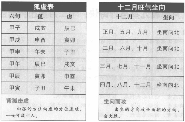 【原文】 黄石公曰:“背孤击虚,一女可敌十人法。法:十人用时孤,百人用日孤,千人用月孤,万人用年孤,惟有时孤最验。”今立成于后。 孤虚表和方位表 奇门遁甲是用于战争方位的选择,其中最重要的就是孤虚法和五帝旺气的坐向,下面就通过两个表格说明方位的正确选择。 【原注】 旺气十倍,相气五倍,休气如数,囚气减少,死气减半也。 【白话提要】 孤虚,又称孤辰、空亡。天干为日,地支为辰,日辰不全即千支不全为孤虚主百事不成。黄石公说:“背孤击虚,一个女人也可以抵挡十个人,古法中十个人用时孤,一百个人用日孤,一千个人用月孤,一万个人用年孤。其中只有时孤最为灵验。” 孤虚见旺气其力十倍,相气其力五倍,休气即不增也不减,囚气减少,死气减半。 |