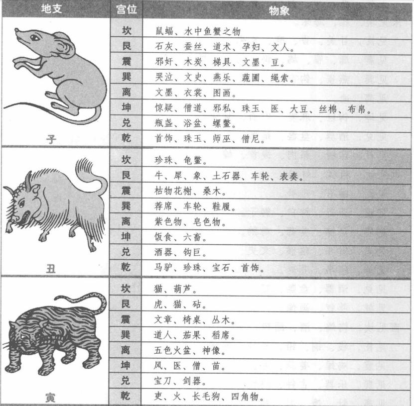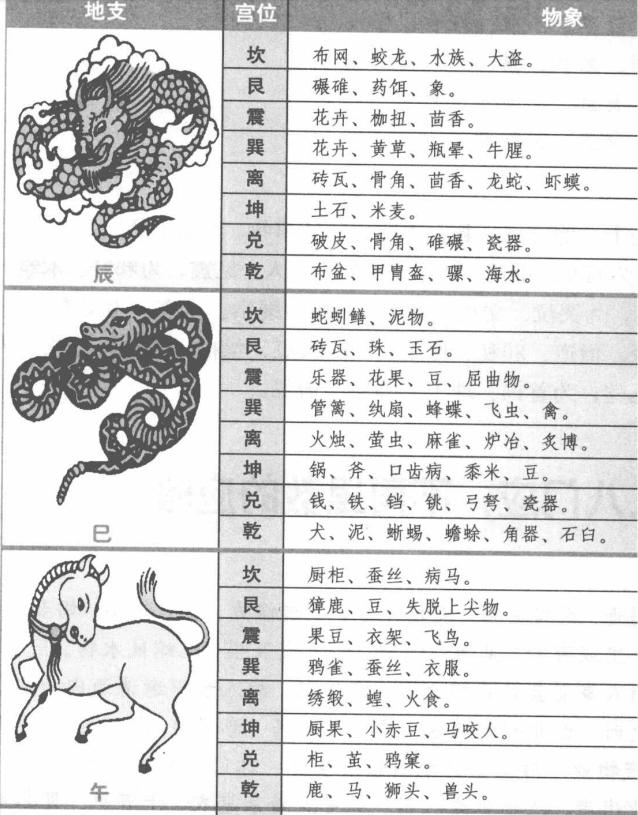 地支应就是十二地支到八卦宫中所遇见的物象,下面就列表说明每个地支到八卦宫中所遇见的物象。