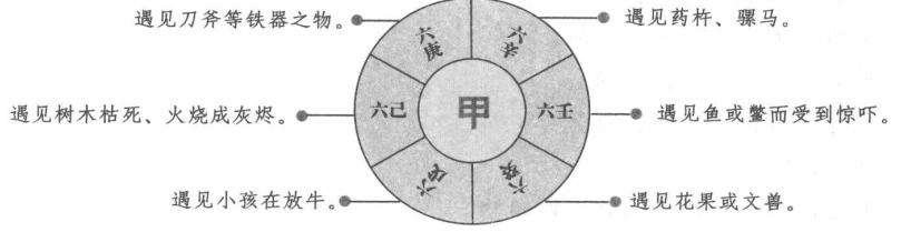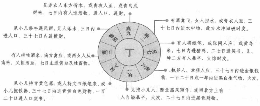 【原文】 甲,数之始,六仪之宰,革故鼎新,重谋别用。 乙,为太阳之精,到乾,有黄衣缠钱及麻衣人应,或百日内,或一年,主进财物。 到坎,有皂衣人鼓声应,或执金银器,后七日内主进人口、财物,或色衣人来,主大发。 到艮,有双禽北来,或青衣人、水姓人送物应,或提铁器人,或渔人,或黑白禽,后一年内进财物,三年内大发。 到震,有渔猎人产妇应,或小儿三五成群,或武士持刀枪,或雷声、鼓声,三七日内进财帛,其东方有产难事,主大发。 到巽,有白衣人乘马,火惊,或小儿来,或树自枯死,或东方自缢,主大发,后一年内生贵子,进田产。 到离,有患目人及骑牛、白禽、犬、猪,或患足人来,或小儿牵牛来,黑白禽从东南飞来,三七日内进猪、犬,后一年内大发。 到坤,有孝衣人、鸡、犬、牛、马,雷震,或患双目人,或雷伤西方牛马,大发,二七日内进猪、鸡物,六十日内进契书。 到兑,有女人及持铁器人破缺损坏物应,或三五女人来,或东方人家牛马自损,三七日内进商姓人田地或生气之物。 丙,为太阴之精,利明不利暗,到乾,有黑衣人,见双飞禽,或南方人家女子产死,百日内进女子、财物。 到坎,有执杖人、白禽东方来,西方惊散,或黄白飞禽从西北来,东方人家火惊,大发,后六十日或一百二十日内进田地契书。 到艮,有小儿及持铁器人,见牛马,或青衣贵人过,或小儿啼哭声,或渔人,三七日内进金银、青色物,百日内进田契,一年内进白马。 到震,见武士、持铁人,闻雷声、鼓乐,或渔猎人,或小儿成群来,三九日内进生气物,一年内生贵子。 到巽,有色衣人、贵人应,闻锣鼓曲声,或南方有惊慌事,或火惊,主大发,七日内贵人到家,进色衣人财,进契书。 到离,黑黄二鸟应,田畔蚕丝见,七日内或六十日内进横财,一年内进田契,大发。 到坤,见皂衣人,闻东方鹊噪、鼓乐声,三七日内进女人、财物,一年内进绝户田地,大发。 到兑,有执杖人或抱小儿人,鼓声响,或艮、坤二方老人死,大发,七日内进财帛,百日进人口,一年内进田地。 丁,为玉女,得之者生,失之者死。若合壬遁发用更应丁加螣蛇,见马走丁加白虎,见孝服加太常,见术艺加大阴天后,见女人走加天空,见奴婢走加元武, 见贼走加朱雀,见口舌斗争加勾陈,见兵戈动加青龙,见马奔腾加六合,见子孙远出加六庚,六辛为凶动。 到乾,执斧人、牵猪人应,三七日内进金银钱物,一百二十日或一年内进黑白生气物,大发。 到坎,见抱小儿人,西北黑风雨作,或西北方上有人自缢暴卒,大发,二七日内进黑色财物。 到艮,见小儿持青黄色器,或人持文书纸笔来,或小儿抱铁器,三七日内进青黄白色财物,一百二十日进人口契书。 到震,有人持牲酒来,南方禽应,或两女人从南来,又担酒至,七日主进黄白及牲畜物。 到巽,见小儿乘牛遇风雨,见人落水,三日内进人口,三七日内进横财。 到离,见赤衣人东方斫木,或青衣人至,或青鸟成群来,七日内有人送酒物,进人口,进财。 到坤,有黑禽飞,女人担水,或青衣人至,三七日内进水中物,此方水冲田破时发。 到兑,有人将纸笔,或张网人应,或黄鸟来,七日内进猪鸡,二七日进契书,艮、坤二方有人暴卒,火惊时发。 甲加六戊,见小童牧牛。 加六已,木见枯木、火灰。 加六庚,见刀斧铁器。 加六辛,见药杵、骡马。 加六壬,见鱼鳖相惊。 加六癸,见花果文兽。 奇仪主应 这里所讲的奇仪主应主要包括三奇到八卦宫中所应和甲到六戊所应,下面就详细说明其所应之物。 【白话提要】 此段主要讲的是三奇和六仪所应,分为三奇到八卦各宫所应和甲加六仪所应。三奇到八卦宫所应,即乙、丙、丁三奇到八卦各宫的应验,共二十四条,比如,乙奇为太阳之精,到乾宫,主有黄衣缠钱以及麻衣人为应,百日内或一年,主进财物。到坎宫,主有黑衣人鼓声为应,或执金银器,后七日内主进人口、财物,或穿有颜色衣服的人来,大发。到艮宫,有双禽北来,或青衣人、水姓人送物应,或提铁器人,或渔人,或黑白禽,后一年内进财物,三年内大发。等等。 甲加六仪所应是:甲加戊仪,会遇见小孩在放牛;甲加己仪,会遇见枯木和火的灰烬;甲加庚仪,会遇见刀斧铁器;甲加辛仪,会遇见药杵和骡马;甲加壬仪,会遇见鱼鳖而惊恐;甲加癸仪,会遇见花果文兽。 |