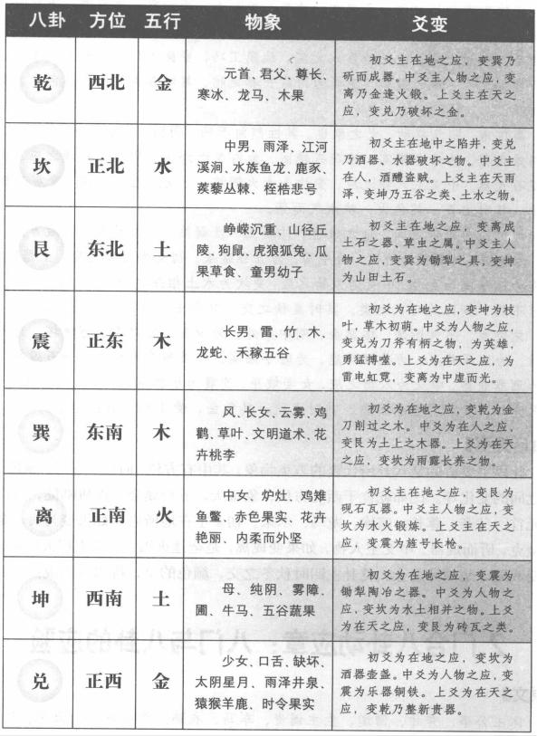 奇门遁甲中地盘八卦代表着丰富的物象,下面就列表详细解说各卦代表的物象和爻变。