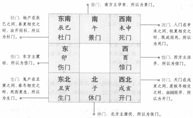 天门在戌亥之间,是秋冬相交之时,由阁而开,所以为开门;地户在辰巳之间春夏相交之时,由开而杜,所以为杜门,人门在申未之间,秋夏相交之时,既成而死,所以为死门;鬼户在丑寅之间,春冬相交之时,死而复生,所以为生门,这就是八门的定位。