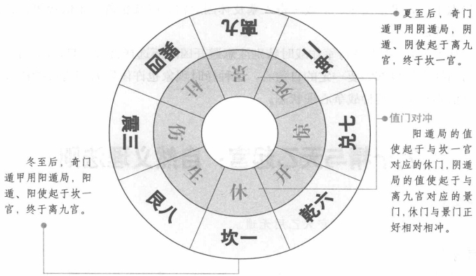 九一精要 奇门遁甲所用的九宫八卦源于河图洛书,其中每两个相对宫的和都为十,而阴阳二遁就从坎一宫和离九宫开始,又终于离九宫和坎一宫,这就是九一精要。 【原文】 十精为使用为贵,起官天乙用无遗。【原注】 葛洪曰:“逾出于五土,归于九一者,为十也。”要精于九一之谓。阳遁阳使,起一终于九;阴遁阴使,起九终于一。天乙值使起宫异,所谓值门相冲也。阴阳二遁,各有二使。 假令冬至后,阳使起休门,阴使起景门,阳使起休门。故曰:值门相冲,今知用遁,自冬至后一百八十二日六十二分半,历子午之东部,阳气用事,惟阳遁阳使。夏至后一百八十二日六十二分半,历子午之西部,阴气用事,惟阴遁阴使。古经云:“冬至后用阴使,夏至后用阳使,经述不显,隐伏之事也。”是穷天地侔造化,以通神明,以类万物之情。三光之回旋,四季之往复,一消一息,或升或降,而运之于无形,布之于无象。有所不见,以俟后人。若能谙此理,用之为贵也。 【白话提要】 按河图与洛书上的数理,中宫为五土,二五为十;每两相对应的方位与宫数相加起来也是十,例如坎一宫与离九宫相对应,其数合为十。所以说“出五土,归于九一”,此规律是术数的“精要”之处。 所谓九一精要,是说阳遁、阳使起于一宫,终于九宫;阴遁、阴使起于九宫,终于一宫。天乙值使起宫不同,所谓值门相冲。奇门遁甲的阴阳二遁各有两个门使。例如冬至后,阳使起于休门,而阴使起于景门,休门与景门相对相冲。在冬至后的一百八十二天六十二分半厘的时间里,在按地支分布的盘图上,子午纵线的东边属阳气用事,因此只用阳遁、阳使,而到夏至后的一百八十二天六十二分半厘的时间里,在子午纵线的西部,属于阴气用事,所以只用阴遁、阴使。据说古经上常只述其法而不述其理,其实都有理在,都是“穷天地,谋造化,以通神明”的自然义理法则。奇门遁甲用来象征万物的情况,阴阳二气包括五行生克、旺相休囚及九星出没、八门运转等吉凶征兆,都在不知不觉地变化着,没有具体的形象可供人们观察,后人如果能明白其中的道理并使用它,就是可贵的了。 此信息最后更新时间为:2015-11-4 00:00