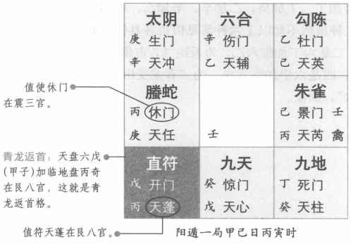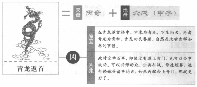 【原文】 甲加丙兮龙反首。 【原注】 天上甲子加地丙,名青龙返首。葛洪曰:“此局吉,宜举百事,虽无吉门卦局,亦可用事。阴阳二遁,此时可以出兵行营,举造利为,百事皆吉。若合奇,最为良也。假令冬至上元阳一局,甲己之日丙寅时,六丙在八宫,以天上甲子天蓬值符,加时干六丙于八宫,得天蓬为六甲六丙在八宫之上。此名青龙返首。解曰:六甲加丙,在门上是也。利见大人、求名、举兵,利客,扬威万里,出入利此时,从生击死,一敌万人。 【白话提要】 龙返首又称“青龙返首”,与“青龙逃走”相对应,预示吉祥。青龙为贵神青龙回头眷顾,自然是比喻吉祥如意的事情。在奇门遁甲中,凡遇到天盘的甲子加临地盘的六丙,这种局象就称为“青龙返首”。因为甲木为青龙,下生丙火,所以天盘甲子加地盘丙奇为青龙反首。这种格局很是吉利,和“飞鸟跌穴”一样,宜举百事,即使没有遇上吉门,也可以办事成功。如果遇到此种局象,可以兴师动众,出兵征战,修造埋葬,远行婚嫁等,诸事均吉,如果再配合上奇门,那就更好了。 比如冬至上元阳遁一局,甲、己之日,丙寅时,这时六丙排布在民八宫内,用天盘上的甲子及天蓬星为值符,加临时的天干六丙于民八宫,可见天蓬星为六甲六丙均在民八宫之上,这种局象就是“青龙返首”。这里还有解辞,六甲加丙在哪个门的方向上,预示着利于见到圣明伟大的人,求名谒见、举兵兴师,利于客体一方,可以扬威万里,出入远行吉利,此时从生门方向攻击死门方向的对手,可以以少胜多。 白话图解 青龙返首格 奇门遁甲中的飞鸟跌穴格是指天盘甲子加临地盘丙奇,和飞鸟跌穴格一样此时宜举百事,即使没有遇上吉门,也可以办事成功。 |