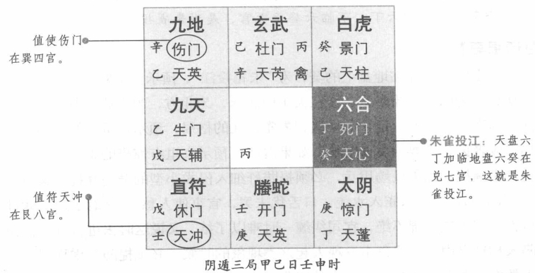 比如夏至中元阴遁三局,甲、已日,壬申时,这时六丁排布在乾六宫,用值符天冲星加临时的天干六壬于民八宫,就可见六丁下临六癸于兑七宫的局象,这种格局就是“朱雀入江”。