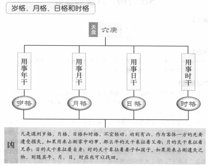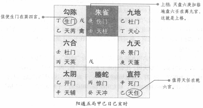 【原文】 加壬之时为上格,又嫌岁月日时逢。 【原注】六庚加六壬,谓之上格。一云:伏格,当此之时,并不宜行师,《经》云:“六庚,当年太岁之干名,曰岁格,此时用事凶。”《奇门大全》云:“六庚加今岁干,如甲子年,庚加甲子也,大凶。六庚加年月、日、时干,动有凶格,闻客先败,占家,年为父母,月为兄弟,日为已身时为妻。男占遗失,随其日、月应兆获。” 假令辛丑年立春中元阳遁五局,岁干在辛,以甲己之日,日入癸酉时,六庚在七宫,以值符天禽,加六癸于一宫,即见天柱六庚,下临六辛岁干于八官,此名为岁格也。 论月格。《三元经》曰:“六庚加月朔格,为凶时也。” 假令立春上元阳遁八局,月朔干在甲己,甲已日丁卯时,此时六庚在一宫以值符天任,加六丁于五宫,即得天蓬为六辛,下临月朔干六已于九宫,此名月朔格也。 论日格。《经》曰:“六庚加当日日干名,曰日干格,此时大凶。假令小署下元阴五局,日干在甲己,已日丙寅时,以天禽为值符。加时干六丙于七宫,即六庚在三宫,下临日干已于四宫,此名日干格。 时格。《经》曰:“六庚加本时干者,为时格,亦名伏吟格。此时六庚在四宫以值符天辅加时,不可举兵用事,大凶。 假令小寒上元阳遁二局,丙辛日已丑时,六庚在四宫,以值符天辅,加时干六己于三宫,此为时格也。凡六庚为值符,其十时皆为时干格也。 上格示例 奇门遁甲中有上格,此格是天盘六庚加临地盘六壬,此时也不宜出师作战否则会有凶险。 【白话提要】 天盘六庚加临地盘六壬为上格,也称小格或伏格,此时也不宜出师作战。比如小满上元阳遁五局,丙、辛之日,已亥时,天任为值符,加时千六已于乾六宫, 则天盘天柱六庚下临六壬于离九宫,这就是“上格”。除上格外,还有岁格、月格、日格、时格。凡是天盘六庚加临用事之时的年、月、日、时的天干,不宜轻动,动则有凶。有格之时,作为客体一方的先要遭受损失。如果用来占测家中的事,那么年的天干象征着父母;月的天干象征着兄弟;日的天干象征着自身;时的天干象征着妻子和孩子。如果用来占测遗失之物,则随其年、月、日、时应兆可以找回。 据三元经上说,天盘六庚加临地盘当年的太岁之干,为岁格。太岁之干,是指用事当年的天干。据说此时举事逢凶。《奇门大全》上说,六庚加临年干,如甲子年,六庚加临甲子,预示大凶。比如辛丑年,立春中元阳遁五局,年干在辛,以甲、己之日,癸酉时布局,则六庚排布在兑七宫,用值符天禽星加临六于坎一宫,就可见天柱星与六庚下临民八宫见六辛年干的局象,这种格局就是“岁格”。三元经上说,天盘六庚加临地盘当时的月的天干,为月格,用事大凶。比如立春上元阳遁八局,月朔之天干在甲、己日,丁卯时,这时六庚排布在坎一宫,用值符天任星加临六丁于中五宫,寄处二宫,就能得到天蓬星与六庚下临月朔干六己于离九宫的局象,这种格局就是“月格”。 三元经上说,天盘六庚加临当日的天干,为“日格”,又称“伏干格”,此时大凶。比如小暑下元阴遁五局,甲、己日,丙寅时,日干是甲、己,用值符天禽星加临时干六丙于兑七宫,就可得到六庚下临日干己于巽四宫的局象,这种格局就是“日格”。 三元经上说,天盘六庚加临本时的天干,为“时格”,又称“伏吟格”,此时不可以举兵与用事,否则大凶。比如小寒上元阳遁二局,丙、辛日,已丑时,这时六庚排布在巽四宫,随值符天辅星加临时干六已于震三宫,这种局象就是“时格”。另外,凡是六庚作为值符的时候,被它所统领的相应的十个时辰都是“时干格”。 |