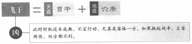 奇门遁甲中有飞干格.此格是用事日的天干加临地盘六庚,此时时机未到还不宜于行动,尤其是处于客体的一方,没有什么主意好打。