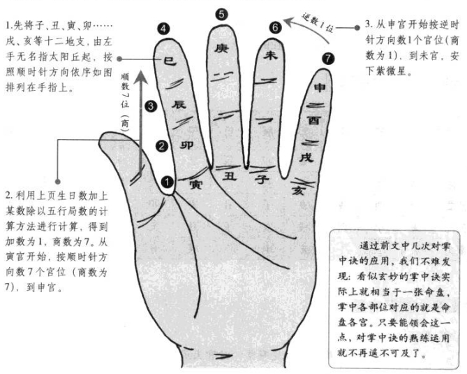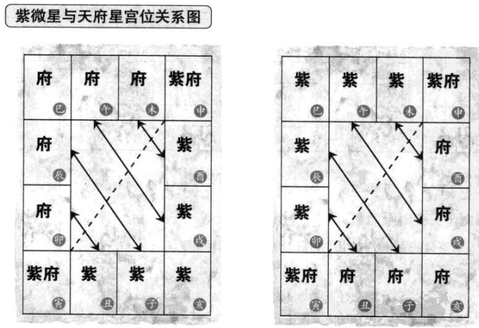 第五步:安紫微星 计算紫微星宫位法则 法则一 生日数可以被五行局数整除时: 生日数÷局数=商数 (局数:水2.木3.金4.土5.火6) 安紫微星掌中诀实例 安紫微星同样可以运用掌中诀。以下仍沿用之前吴斯人先生的实例作说明(阴男,丁亥年十二月二十七日卯时生,五行为金四局)。 由寅宫顺数商数,所临宫位安紫微星。法则二生日数不能被五行局数整除时:(生日数+某数)÷局数=商数 1.所加某数为奇数时: 由寅宫顺数商数,再由所临宫位逆数某数后,安紫微星。 2.所加某数为偶数时: 由寅宫顺数商数,再由所临宫位顺数某数后,安紫微星: 第六步:安紫微星系诸星 歌诀: 紫微天机星逆行,隔一阳武天同情;又隔二宫廉贞位,空三复见紫微亭。 速简歌缺: 紫机逆行,隔一阳武同; 隔二廉贞;隔三回紫宫 说明: 紫微星的宫位逆行一位就是天机星的宫位,天机星的宫位逆行隔一宫则为太阳星的宫位,接着逆行各一宫位分别安下武曲星和天同星,又逆行隔二宫就是廉贞星的宫位,再空三宫又复回而见到了紫微星所在的宫位了。 第七步:安天府星 歌诀: 局定生日逆布紫,对宫天府顺行流;唯有寅申同一位,其余壬卯互安星。 说明: 1.天府星除了寅、申二宫与紫微星同座外,其余各宫皆与紫微星相对。 2.将紫、府同座的寅、申二宫连成一直线,遂将命盘一分为二,紫微星居右、天府星就居左,紫微星安左、天府星就安右。 3.将紫、府相对宫距最远的巳、亥二宫连成一线,其余紫、府相对二宫皆与巳亥线相平行。 此信息最后更新时间为:2024-11-14 22:56 |