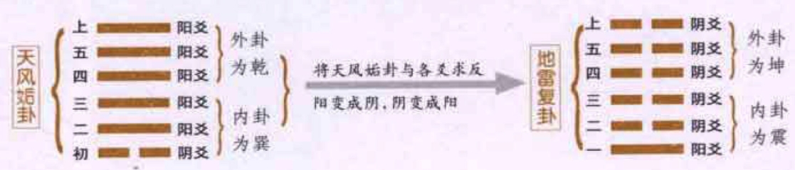 错综复杂,通常给人的误解是,这是四个卦名,实际上这是六十四卦中两个卦之间的关系。 错卦,又称对卦和旁通卦,指阴阳相对的卦;综卦,就是把一个卦的初爻到上爻的位置依次调换,也就是换一个方向来看原卦,就得到了原卦的综卦;错卦是正对,综卦是反对。复杂就是交互卦,交卦是由三四五爻组成的卦,互卦是二三四爻组成的卦,互在下,交在上,组成一个新的六爻的卦就是原卦的交互卦了。所谓你中有我,我中有你。有了错综复杂的概念,就是说一个人看问题要全面。 错卦 错,阴阳交错,也就是把一个卦的各个爻求反(阳变成阴,阴变成阳)就得到了该卦的错卦。错卦的理是立场相同,目标一致,可是看问题的角度不同,所见也就不同了。如:天风姤(gòu) 卦,它的第一爻是阴爻,其余五爻都是阳爻,那么在阴阳交错之后,就变成了复卦,第一爻是阳爻,其余五爻都是阴爻,如复卦的卦象,它的外卦是坤,坤为地,内卦是震,震为雷,就是地雷复卦,所以天风姤卦的对错卦,就是地雷复卦。 六十四卦,每卦都有对错的卦。因此学了《易经》以后,以《易经》的道理去看人生,一举一动,都有相对、正反、交错,有得意就有失意,有人赞成就有人反对,人事物理都是这样的,离不开这个宇宙大原则。 综卦 综卦,又称反卦和覆卦,指将一卦反复(颠倒)过来所得到的卦。综卦的作用,在于将我心换你心,希望能设身处地地为相对人思考,不要凡事都只站在自己的立场上衡量。我们仍拿姤卦来说吧,如果把姤卦作180度倒转,则成为泽天夬(guài)卦,这是姤卦的反卦,也即综卦。综卦是相对的,全部六十四卦,除了八个卦以外,没有不相对的。这八个卦是乾、坤、坎、离、大过、小过、颐、中孚。八个卦中的前四卦乾、坤、坎、离,是天地日月的宇宙现象,从任何角度看,天绝对是天,地绝对是地,太阳与月亮也仍是日月;后四卦,大过、小过、颐、中孚,是属于人事的,但却有其不变的性质,所以也没有综卦。 错综复杂之错卦与综卦 错综复杂,通常给人的误解是,这是四个卦名,实际上这是六十四卦中两个卦之间的关系。 错卦 错卦,又称对卦和旁通卦,指阴阳相对的卦,就是把一个卦的各个爻求反(阳变成阴,阴变成阳)就得到了该卦的错卦。 天风姤卦第一爻是阴爻,其余五爻都是阳爻。 阴阳交错之后,天风姤卦变成了地雷复卦,第一爻是阳爻,其余五爻是阴爻. 综卦 综卦,又称反卦和覆卦,指将一卦反复(颠倒)过来所得到的卦。 为什么六十四卦中,有八个卦是没有综卦的呢? 这是因为这八个卦的前四卦乾、坤、坎、离,是天地日月的宇宙现象,从任何角度看,天绝对是天,地绝对是地,太阳与月亮也仍是日月;后四卦,大过、小过,颐,中孚,是属于人事的,但却有其不变的性质,所以也没有综卦。 除此之外五十六卦都有综卦,这则表明宇宙间的事物是相对的。 交互卦 《易经》中复杂的道理,实际上就是指的交互卦。 什么是“交互”呢?是指在一个六爻卦中,除上卦与下卦两个经卦外,又由二爻、三爻与四爻,三爻、四爻与五爻构成两个新的经卦。这种由上下两卦交互组成的新卦象,古人称为交互卦。 如第二爻上连到第四爻,下面挂到上面去为互,第五爻下连到第三爻,上面交至下面来为交,这是交与互的不同,每卦的纵深内在,又产生了卦。 换句话说,这是告诉我们看事情,不要看绝了,不要只看一面,一件事情正面看了,再看反面,反面看了,再把旁边看清楚,同时旁边亦要看反面。这样四面都注意到了,还不算完备,因为内在还有变化,而内在的变化,又生出一个卦来。除了乾、坤两卦外,别的卦把中心拿出来交互,又变出了一种现象。这现象的本身,又有综卦,又有错卦,这就是八面看东西,还要加上下一共十面,所以要多复杂有多复杂。 现在以火雷噬(shi)嗑(kē)卦为例进行说明,如以噬嗑卦的第二爻与第三爻、第四爻卦配上去,便成为代表山的艮卦,这就是噬嗑卦的互卦。若把噬嗑卦的第三爻交到第四、第五爻上去,便成为代表水的坎卦,这就是噬嗑卦的交卦。再把噬嗑卦的交卦和互卦重叠起来,便成为水山蹇卦,因此噬嗑卦的交互卦就是蹇卦。 错综复杂之交互卦 在一个六爻卦中,除上卦与下卦两个经卦外,又由二爻、三爻与四爻,三爻、四爻与五爻构成两个新的经卦。这种由上下两卦交互组成的新卦象,古人称为交互卦。 为什么说交互卦复杂呢? 这是从交互卦本身的道理上说的。一件事情不要只看一面,四面都注意到了,还要看内在,除了乾、坤两卦,别的卦把中心拿出来交互,又会变出一种现象。这现象本身,又有综卦又有错卦,所以要多复杂有多复杂。 火雷噬嗑卦的交卦坎和互卦艮重叠起来,便成为水山蹇卦,所以火雷噬嗑卦的交互卦就是水山蹇卦。 此信息最后更新时间为:2024-10-30 15:36