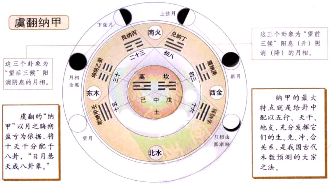 | 纳甲是易学术语。就是在六爻卦上装配天干和地支,并与五行、方位相配合。即乾纳甲壬,坤纳乙癸,艮纳丙,兑纳丁,坎纳戊,离纳已,震纳庚,巽纳辛,因甲为十干之首,故名纳甲。 “纳甲”之说始于汉代,汉代纳甲分为京房和虞翻两派。京房“纳甲”多用于占筮。先将六十四卦分八宫,即乾、坎、艮、震、巽、离、坤、兑,四阳四阴为八大纯卦。每宫一卦,下接七卦,由下至上,即本卦、一世、二世、三世、四世、五世、游魂、归魂。宫中每卦,均分别为世、应二爻、语出《乾凿度》:“易气从下生,动于地之下,则应于天之下。动于地之中,则应于天之中。动于地之上,则应于天之上。初以四、二以五,三以上,此之谓应。”以本宫卦所属的五行,视卦爻世应纳得的干支五行,因而定出“六亲”,“六亲”即“父母、兄弟、子孙、妻财、官鬼”等。又配以“六神”,“六神”即“青龙、白虎、朱雀、玄武、勾陈及螣蛇”等。这是京房纳甲的大概。 虞翻的“纳甲”则以月之晦朔盈亏为依据,将十天干分配于八卦,虞翻认为“日月悬天成八卦象。”他以坎离来象征日月,居中为戊已土。其余的八干分配为乾纳甲壬、坤纳乙癸、震纳庚、巽纳辛、艮纳丙、兑纳丁。 震卦象征每月初三的新月相,现于西方庚位,为一阳始生之象,兑卦象征每月初八上弦月相当于南方丁位,为震加一阳之象;乾爻全阳之象,是十五满月,也就是望月之时。月分六候,每五日一候,这三个卦象为“望前三候”。是阳息(升)阴消(降)的月相。之后月亮由圆渐缺。巽卦表示十六日的月象由圆而缺,为一阴萌生之象,微缺的月亮没于西方辛位,艮更增一阴,当二十三日下弦,月亮没于南方丙位;坤爻全阴,表示三十日月伏于东北乙位,此时月相全黑;这三个卦象是“望后三候”,是阳消阴息的月相。 纳甲的最大特点就是给卦中各种因素都配以五行、干支,充分发挥它们之间的生、克、冲、合关系,是我国古代术数预测的大宗之法,俗称六爻法,在古代非常普及,直至现代仍有流传。 易学术语纳甲 纳甲是易学术语。就是在六爻卦上装配天干和地支,并与五行、方位相配合。因甲为十干之首,故名纳甲。 京房纳甲 京房“纳甲”多用于占筮。先将六十四卦分八官,四阳四阴八大纯卦。每官一卦,下接七卦,由下至上,即本卦、一世、二世、三世、四世、五世、游魂、归魂。 宫中每卦,均分别为世、应二爻、视卦爻世应纳得的干支五行,定出“六亲”等进行占断,这是京房纳甲的大概。 什么叫世应呢? 世和应是相对的,一般把世当作自己的方面,把应当作他人的方面.世爻与应爻总是隔着两位,如世在初爻,应则在四爻等。确定卦的世爻,依据的是卦的八宫位置,如八纯卦的世在上爻,一世卦世在初爻等。而游魂卦则世在四爻、归魂卦世在三爻。 虞翻的“纳甲”以月之晦朔盈亏为依据,将十天干分配于八卦,“日月悬天成八卦象。" 纳甲的最大特点就是给卦中配以五行、天干、地支,充分发挥它们的生、克、冲、合关系,是我国古代术数预测的大宗之法。 此信息最后更新时间为:2024-10-30 15:36