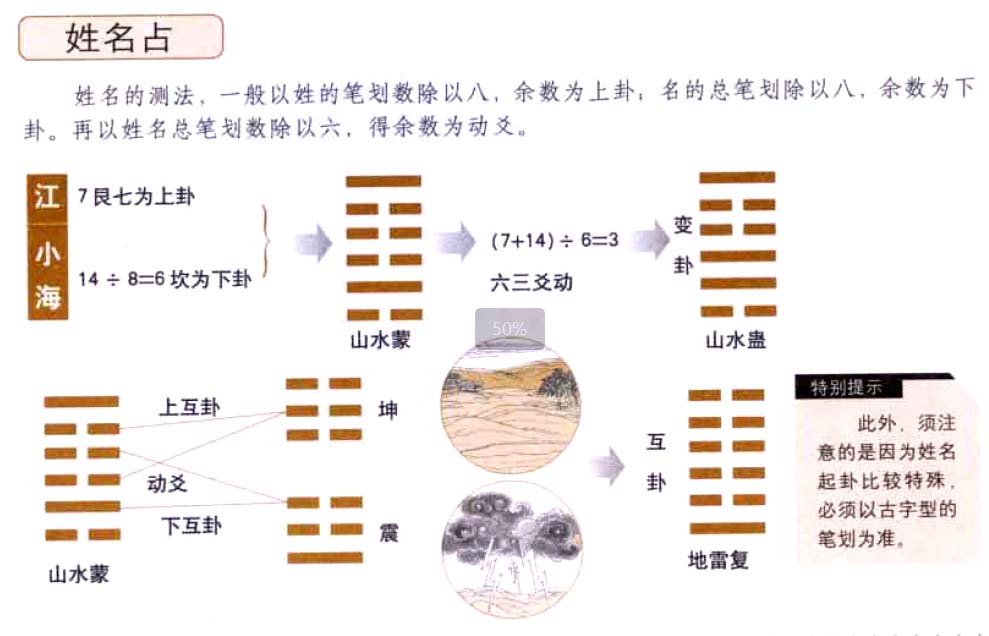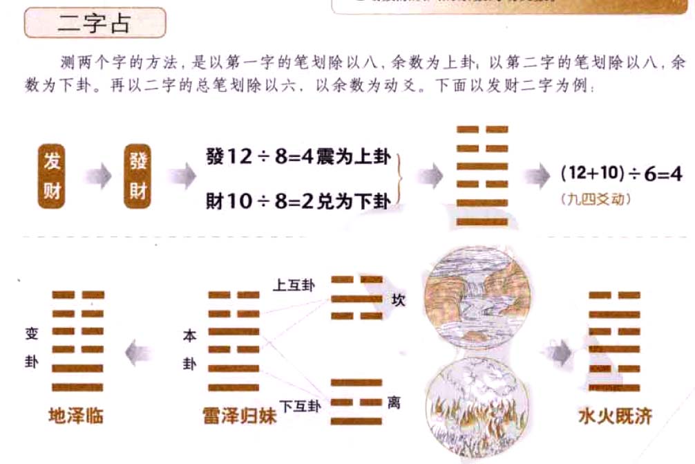 | 梅花易数起卦法最大的特色就是只要有数就可起卦因此,中国文字也可用来起卦。举凡一字二字三字,甚至多字皆可。 测字起卦的步骤与方法 一字占 中国文字可约略分为有偏旁的合体字与不可分割的独体字,所以测字起卦,必须先判断是独体字还是有偏旁的字,若是不可分割的独体字,以其笔划总数平均分之,若笔划为偶数,则各分一半,若为奇数,则以笔划少者为上卦,笔划多者为下卦。若属有偏旁的合体字,可大致分为左右型、上下型、内外型三类。 (1)左右型的字: 如“判”、“搭”、“伴”等字,以左边的笔划数为上卦,右边的笔划数为下卦,再以总笔划数除以六,以余数为动爻数。 (2)上下型的字: 如“雷”、“些”、“奇”等字,以上字笔划为上卦,下字笔划为下卦。 (3)内外型的字: 如“国”、“因”、“问”等字,以外笔划为上卦,内笔划为下卦,总笔划数除以六的余数为动爻数。 二字占 二字占的方法,是以第一字的笔划除以八,余数为上卦;以第二字的笔划除以八,余数为下卦。再以二字的总笔划除以六,以余数为动爻。例如以“发财”二字占问财运,“发”字十二划,除以八余四,震木为上卦,“财”字十划,除以八余二,兑金为下卦。得本卦雷泽归妹,“发财”二字总笔划为二十二,除以六余四,四爻动,得变卦地泽临。上互卦坎水,下互卦离火。 姓名占 姓名占的算法,一般以姓的笔划数除以八,余数为上卦,名的总笔划除以八,余数为下卦。再以姓名总笔划数除以六,得余数为动爻。如“江小海”,“江”字七划,不满八划,不必除以八,直接以七为上卦,故艮七为上卦。“小海”总共十四划,除以八余六,坎六为下卦。姓名总笔划二十一,除以六余三,三爻动,故可得本卦山水蒙,变卦山风蛊。上互卦坤地,下互卦为震雷。 此外,须注意的是以姓名起卦比较特殊,必须以古字型的笔划为准,如①“清”、“河”、“江”等字,皆以四划“水”为部首。②提手旁者,应为“手”部四划。如“抢”、“提”、“捉”③竖心旁者,应为心部四划。如“情”、“怀”、“忆”。 四字占 四字为四象,平分二字为上下卦,四字笔画相加除以六的余数为动爻。 五字占 五字为五行,以前二字为上卦,以后三字为下卦,以五字相加除以六,除 不尽之数仍取五为动爻,即五爻动。 六字占 平分三字为上下卦,以六字为动爻,即六爻动。 七字占 以前三字为上卦,后四字为下卦,以七数除以六的余数为动爻,即初爻动。 八字占 平分四字为上下卦,以八数除以六的余数为动爻,即二爻动。 九字占 以前四字为上卦,后五字为下卦,以九数除以六的余数为动爻,即三爻动。 十字占 平分五字为上下卦,以十数除以六的余数为动爻,即四爻动。 十一字占 十一字以上至于百字,皆均分其数以起卦,或以少一字者为上卦,多一字者为下卦,以两数相加除以六的余数为动爻。 此信息最后更新时间为:2024-10-30 15:37