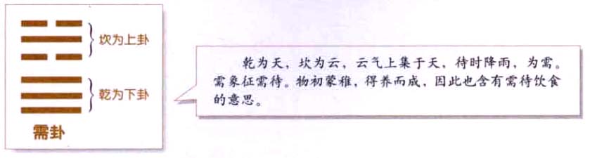 需卦乾下坎上,乾为天,坎为云、云气上集于天,待时降雨,谓之需、需者、待也。需象征需待,物初蒙稚、得养而成、因此也含有需待饮食的意思。