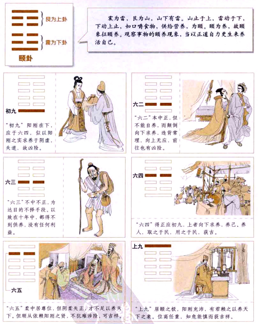 卦义颐养之道,守正则吉。观察事物的颐养现象,应当以正道自力更生来养活自己。 爻义“初九”阳刚在下,足以自养,但其应于六四,而动于欲。似以阳刚之实求养于阴虚,养身失道,故凶险。 “六二”本中正,但其不能以柔顺中正自养,而颠倒向下求获颐养,违背常理,向上求养,但上九地位太高,而且与六二不相应,以此前往必有凶险。 “六三”阴居阳位,不中不正,为达目的,不择手段,违背了养的道理。由于养的手段不正当,养的目的即或正当,也会凶险,以致在十年中,都得不到供养,没有任何利益。 “六四”得正应初九,上者向下求养,养己、养人,取之于民,用之于民。虽似颠倒向下求养,但能获吉。 “六五”柔中,居尊位,应养贤及万民。可是,其阴柔失正,且无应,才不足以养天下。但能顺从依赖阳刚(上九)之贤,安居守正,不犯难涉险,可获得吉祥。 “上九”卦主,居颐之极,阳刚充沛,有臣贤于君,君赖之以养天下之象。位高任重,知危能慎而获吉祥,可以排难涉险,吉祥。 本卦说明本卦赞美颐养之盛德,当物资蓄积富足之后,就可以养育天下了。但养育应靠自己,不可依赖,不可羡慕,应当运用智慧,使天下得到供养。不过,当不得已时,只要正大光明,也不妨取之于民,用之于民,但要威而不猛,公正严格。养人之道,当出于公心,如《管子》所云;“王者以民为天,民以食为天。” 具体事占吉凶占天时:天色阴沉,欲晴,欲雨不雨,午未当晴。 风水:墓下有溪涧,前有人家,后有古墓或窟。 求官:不遂,反生忧闷,亦主受骗。 婚姻:男克头妻,女克头夫,终成。 家宅:山下有路,或两头门出入,出游荡子,各宜守旧。 六甲:头胎子无害,春占生男,产妇有风疾。 出行:宜往西北方,女无阻滞,壬癸占,去不成。 求财:能得二三分财。 捕盗:在东北岩石之所,可捉。 交易:只宜守旧。 见贵:难见之兆。 求事:犯重则遂。 田蚕:如常。 行人:一往一来,事多疑虑,反复欲动不动,则见于途。 寻人:不久相逢,多虚少实。 遗失:在篱墙下水涧边。失物在堀坑中,往南北方寻。 疾病:寒热水痛,服药无效,往东北方求医。 词讼:有头无尾,我告他人,终不成。 此信息最后更新时间为:2024-10-30 12:00