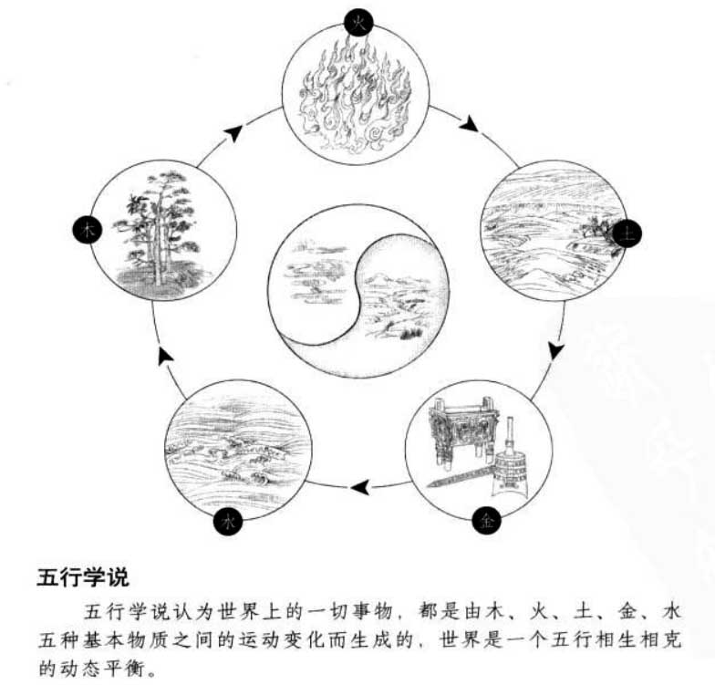 五行学说认为世界上的一切事物,都是由木、火、土、金、水五种基本物质之间的运动变化而生成的,世界是一个五行相生相克的动态平衡。