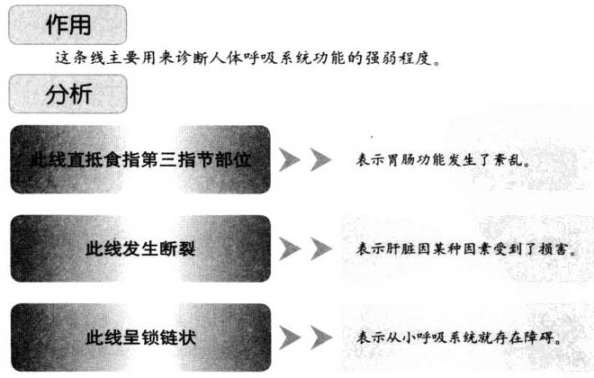 : 第一条线:感情线作用这条线主要用来诊断人体呼吸系统功能的强弱程度,分析此线直抵食指第三指节部位表示胃肠功能发生了素乱此线发生断裂表示肝脏因某种因素受到了损害此线呈锁链状表示从小呼吸系统就存在障碍。 ... ...