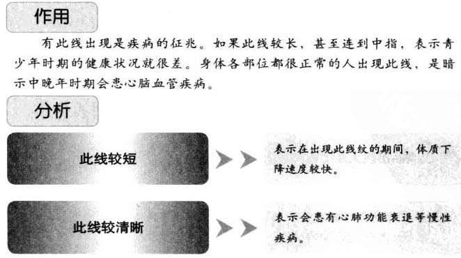 有此线出现是疾病的征兆。如果此线较长,甚至连到中指,表示青少年时期的健康状况就很差。身体各部位都很正常的人出现此线,是暗示中晚年时期会患心脑血管疾病。