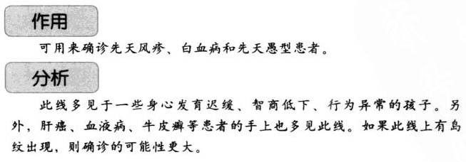 此线多见于一些身心发育迟缓、智商低下、行为异常的孩子。另外,肝癌、血液病、牛皮癣等患者的手上也多见此线。如果此线上有岛纹出现,则确诊的可能性更大。