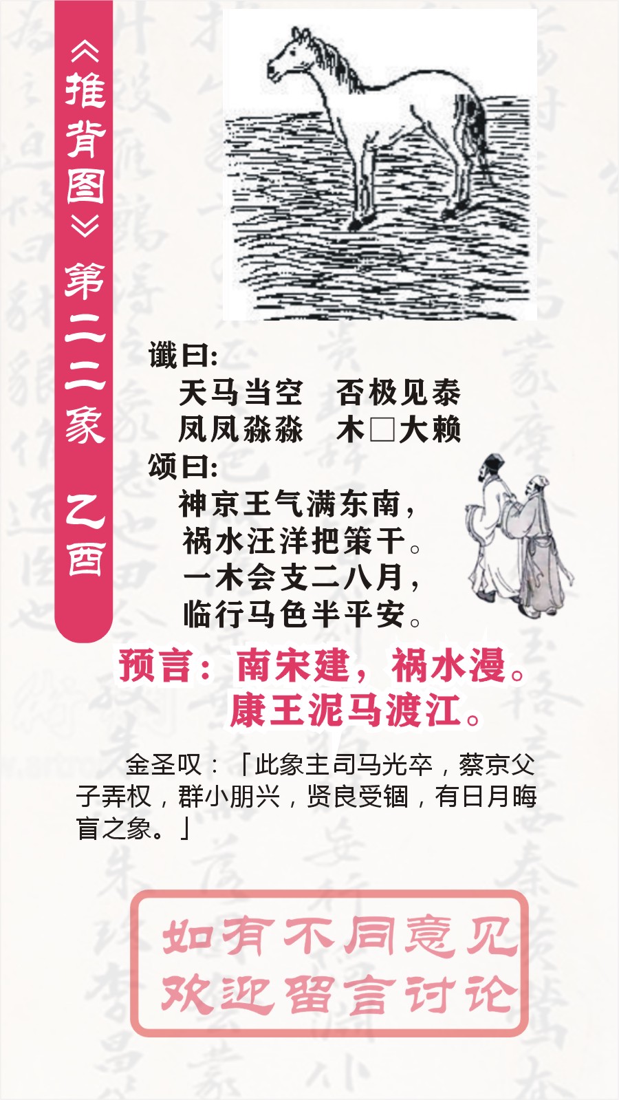 第二二象 乙酉兑下离上睽 谶曰: 天马当空 否极见泰 凤凤淼淼 木冓大赖 颂曰: 神京王气满东南,祸水汪洋把策干。 一木会支二八月,临行马色半平安。 以下是对《推背图》第二十二象的解读: 卦象解读 “乙酉兑下离上睽”,睽卦象征着乖背睽违,即事物之间相互背离、冲突。上卦离为火,下卦兑为泽,火焰向上燃烧,泽水向下流动,两者方向相反,意味着矛盾、对立和变化。这一卦象暗示着此象所预示的时期可能会充满各种矛盾和冲突,局势动荡不安,但同时也蕴含着通过调和、化解矛盾而走向新的发展阶段的可能性。 谶语解读 天马当空,否极见泰: “天马当空”可能寓意着会出现一位如天马般具有非凡能力、能够自由驰骋、纵横捭阖的关键人物,在动荡的局势中发挥重要作用。“否极见泰”则表示在经历了艰难困苦、混乱不安的局面后,即将迎来好转和安定的时期,就像否卦到泰卦的转变一样,意味着局势将从困境中逐渐走向好转,有否极泰来之意。 凤凤淼淼,木冓大赖: “凤凤淼淼”中的“凤”通常象征着吉祥、高贵、权威等,“淼淼”形容水势浩大,可能暗示与女性或某种具有权威性的势力有关,且其影响力如大水般广泛而深远。“木冓大赖”较难确切解释,一种可能是“木冓”合起来为“构”字,也许预示着会有重大的构建、变革或某种势力的相互勾结等情况,而“大赖”可能表示对某个人或某种局面有很大的依赖或者存在着较大的问题隐患等。 颂语解读 神京王气满东南,祸水汪洋把策干: “神京王气满东南”说明当时的京城或者国家的中心地区,其王气主要聚集在东南方向,可能意味着政治、经济、文化等方面的重心或关键力量在东南地区有所体现,东南地区可能相对繁荣稳定或者具有重要的战略地位。“祸水汪洋把策干”则描绘出一种危机四伏的局面,如汪洋般的祸水需要有人用智慧和策略去应对、治理,暗示国家面临着较大的危机和挑战,需要采取有效的措施来化解。 一木会支二八月,临行马色半平安: “一木会支二八月”含义较为隐晦,一种解释是“一木”可能指一个姓氏中带有“木”字的人或与木有关的事物,“二八月”可能象征着时间或特定的时期,也许暗示在特定的时间节点上,这个人或事物会起到关键的支撑作用。“临行马色半平安”中,“临行马色”可能指在即将行动或面临某种情况时,马匹的神色或状态,“半平安”表示情况并非完全安全,而是处于一种半稳定、半危险的状态,整体上意味着局势虽然有所好转,但仍然存在不稳定因素,行动时需要谨慎小心。 需要注意的是,《推背图》是一部充满神秘色彩和争议的古籍,其内容的解读往往具有很强的主观性和不确定性,目前并无确凿的科学证据证明其预言的真实性,仅供研究和探讨历史文化时参考。 第二十二象:乙酉。预言南宋建,祸水漫。康王泥马渡江。 金圣叹:「此象主司马光卒,蔡京父子弄权,群小朋兴,贤良受锢,有日月晦盲之象。」 第1象:(唐朝)甲子 乾下乾上 乾 第2象:(唐朝)乙丑巽下乾上姤(预言武则天称帝) 第3象:(唐朝)丙寅艮下乾上遯(预言武则天造字曌) 第4象:(唐朝)丁卯坤下乾上否(预言张柬之夺回李唐政权) 第5象:(唐朝)戊辰坤下巽上观(预言杨贵妃死于安史之乱) 第6象:(唐朝)已巳坤下艮上剥(预言郭子仪重振大唐) 第7象:(唐朝)庚午震下乾上无妄(吐番部落入寇中原) 第8象:(唐朝)辛未坤下离上晋(李希烈祸乱大唐) 第9象:(唐朝)壬申乾下离上大有(预言黄巢起义) 第10象:(五代)癸酉坎下坎上坎(预言朱温篡唐) 第11象:(五代)申戍兑下坎上节(戏子皇帝后唐庄宗之死) 第12象:(五代)乙亥震下坎上屯(石敬塘割让幽州) 第13象:(五代)丙子离下坎上既济(后周郭威君临天下) 第14象:(五代)丁丑离下兑上革(预言五代终结) 第15象:(北宋)戊寅离下震上丰(宋太祖扫荡群雄) 第16象:(北宋)已卯离下坤上明夷(赵匡胤一统天下) 第17象:(北宋)庚辰坎下坤上师(宋真宗亲征澶渊) 第18象:(北宋)辛巳艮下艮上艮(预言北宋太后刘娥“垂帘听政”) 第19象:(北宋)壬午离下艮上贲(王安石变法) 第20象:(北宋)癸未离下乾上同人(预言蔡京乱政) 第21象:(南宋)甲申兑下艮上损(预言靖康之耻) 第22象:(南宋)乙酉兑下离上睽(康王泥马渡江) 第23象:(南宋)丙戍兑下乾上履(预言蒙古崛起) 第24象:(南宋)丁亥兑下巽上中孚(预言南宋灭亡) 第25象:(元朝)戊子艮下巽上渐(预言元朝国运传10帝) 第26象:(元朝)已丑震下震上震(预言元朝灭亡) 第27象:(明朝)庚寅乾下震上豫(预言明朝开国) 第28象:(明朝)辛卯坎下震上解(预言朱棣篡位) 第29象:(明朝)壬辰巽下震上恒(预言明朝仁宣之治) 第30象:(明朝)癸巳巽下坤上升(预言土木堡之变) 第31象:(明朝)甲午离下巽上家人(预言魏忠贤之乱) 第32象:(明朝)乙未巽下坎上井(预言闯王李自成灭明) 第33象:(清朝)丙申巽下兑上大过(预言清兵入关,传十帝) 第34象:(清朝)丁酉巽下巽上巽(太平天国的预言) 第35象:(清朝)戊戍震下兑上随(火烧圆明园的预言) 第36象:(清朝)己亥乾下巽上小畜(慈喜逃到西安的预言) 第37象:(民国)庚子震下巽上益(建立中华民国的预言) 第38象:(民国)辛丑震下离上噬嗑(第一次世界大战的预言) 第39象:(民国)壬寅巽下兑上颐(日本侵华的预言) 第40象:(近现)癸卯(国家分裂为两岸三地预言) 第41象:(近现)甲辰(文革的预言) 第42象:(近现)乙巳(江青四人帮的预言) 第43象:(近现)丙午(祖国统一的预言) 第44