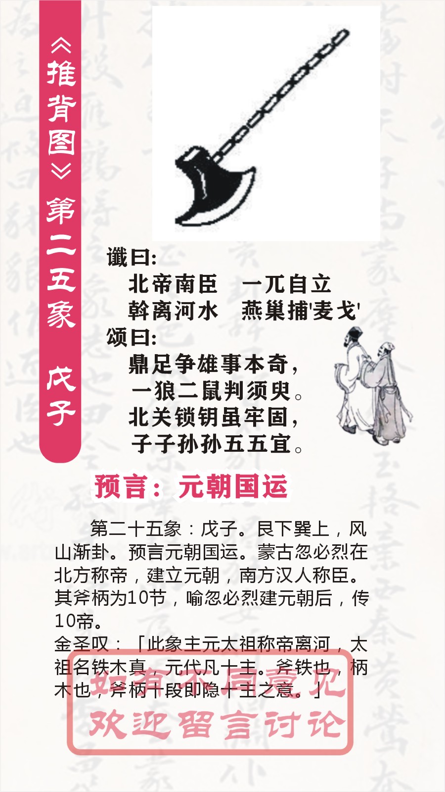 第二十五象:戊子。艮下巽上,风山渐卦。预言元朝国运。蒙古忽必烈在北方称帝,建立元朝,南方汉人称臣。其斧柄为10节,喻忽必烈建元朝后,传10帝。