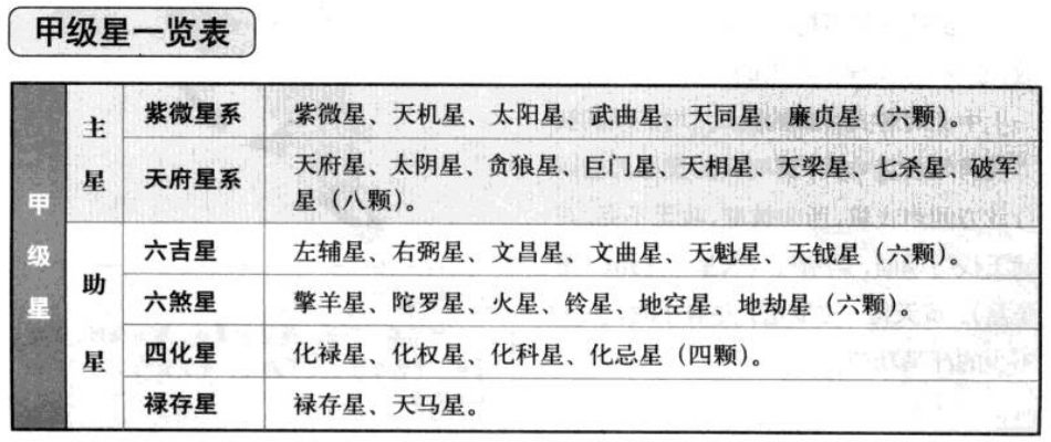其中紫微、天机、太阳、武曲、天同、廉贞(以上六星为紫微星系)、天府、太阴、贪狼、巨门、天相、天梁、七杀和破军星(以上八星为天府星系)等十四颗为主星,其余六吉星、六煞星、四化星、禄存星、天马星为甲级助星。