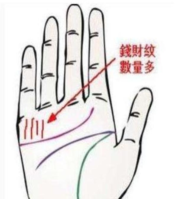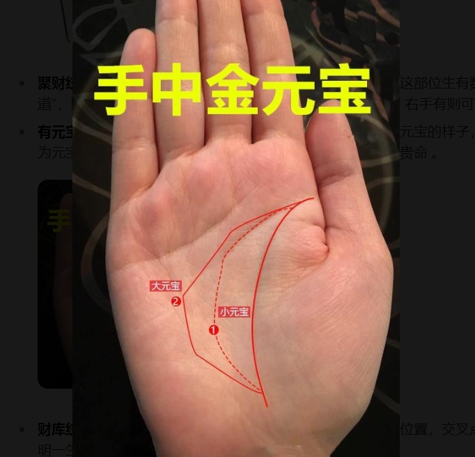 | 以下是一些财运旺的手相特征: 纹路方面 财运线清晰明显:财运线又称为水星线,位于小指根部的短竖线。若此线清晰明显,通常意味着头脑聪明、精明强干,赚钱方法多样,财运旺盛,善于利用身边资源把握商机,在事业上易取得成就 。 太阳线深长:太阳线即朝向无名指根部的上升线,深长的太阳线代表具有较强领导能力和事业心,事业顺利,能实现财富快速积累,一生衣食无忧 。 理财纹明显:在手掌感情线上方有一条平行的纹叫理财纹。有此纹的人通常擅长理财,懂得合理支配财富,可能为企业或他人理财,自身也不会缺钱 。 钱财纹数量多:钱财纹是指在水星丘(小指根部)和太阳丘(无名指根部)之间出现的细斜线。手掌上钱财纹越多,财运越旺,尤其是偏财运好,如工作常发奖金或易意外中奖 。 聚财纹密集:聚财纹是小拇指和无名指下方的多条竖纹。若这部位生有数条密集竖纹,表明一生“横财有道”,财运好且衣食无忧,左手有此纹可通过官运亨通发家,右手有则可能是生意场风云人物 。 有元宝纹:手掌中有三条主线一起和其他辅助线形成犹如金元宝的样子,或上面宽下面窄呈梯形的纹路,称为元宝纹。有元宝纹的人通常比较富有,财运滚滚,天生富贵命 。 财库纹清晰:财库纹位于生命线和智慧线交叉延伸到掌外的位置,交叉点位于掌外时,分岔纹路有几条就表明一生财路有几条,延伸越长,钱财越多 。 手指与手掌形态方面. 大拇指厚实:大拇指在手相学上代表父母和祖上,厚实的大拇指通常表示聪明、勤奋,有强烈事业心和财运,学东西快,能把握商机积累财富,性格稳重值得信赖 。 手指并拢无缝隙:将手指并拢时,各手指根部指缝紧密无缝隙,表示此人有理财头脑,能存钱,懂得合理支配财富,避免浪费,财富积累相对较快 。 手掌三丘饱胀:手掌靠近手指的位置有三个像小山丘一样的鼓包,分别是“离丘”“巽丘”和“坤丘”。若这三个掌丘皆饱满并带微红色,象征财运状况理想,正偏财运势皆稳中有升 。 手掌柔软厚实:手掌饱满肉厚,张开手掌心能自然形成凹坑的人,是守财多福的手相;有弹性软绵绵且厚实的手,代表财运丰厚,理财有智慧,经济头脑好 。 特殊纹路及其他方面 木星丘发达:食指根部的木星丘比较发达,也是主财运的地方,称为巽宫或钱财宫。木星丘饱满、气色血色良好的人,财运必然旺盛,大多是商业发家 。 水星丘红润隆起:水星丘在小指根部,掌管财运、社交与商业头脑。红润且向上隆起的水星丘,代表在商业方面有绝佳才能,财运好,易遇赚钱机会,从事商业经营易成功获丰厚利润 。 太阳丘或木星丘有星纹:在太阳丘或木星丘出现星纹,表示拥有特别好运,易得到意想不到机会和幸运,从而心想事成,赚到财富 。 智慧线有向上支线:智慧线末端有支线向上延伸,表明此人非常有商业头脑,有很强金钱观念,对金钱既眷恋又敏锐,善于利用机会招财 。 此信息最后更新时间为:2024-12-24 09:42