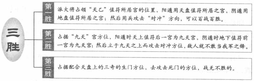 比如大寒时上元阳遁三局,甲、己日,丁卯时,天上值符乘上六丁下临离九宫,即是天乙宫居正南方向,这就是所谓“第一胜”所应该事先占据的位置。九天下临巽四宫,处于东南位置,这是“第二胜”所应占据之处,生门与丁奇配合下临兑七宫,处正西方向,这是“第三胜”所应占据的位置方向。又如阴遁八局,甲、己日,平旦时,地下值符在艮八宫,处东北方向,为天乙宫第一胜地;九天在震三宫,处正东方向,为第二胜地;生门临乾六宫,处西北方向,为第三胜地。据说,除三胜外,还有五个不适宜于攻击的方位,称为“五不击”。第一不击天乙宫,即值符所在之方位,第二不击九天宫,第三不击生门宫,第四不击九地宫,第五不击值使宫,以上五宫都不可以主动去攻击它,否则不利。