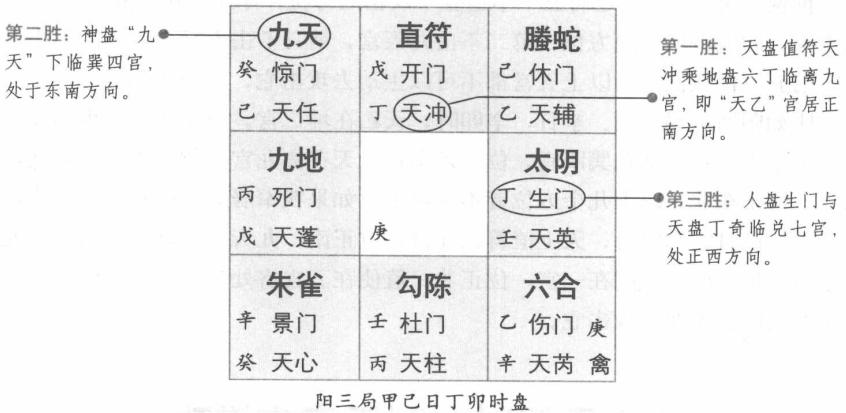 假令大寒上元阳三局,甲已日丁卯时,天上值符乘六丁,临九宫,正南为天乙宫,为第一胜也。九天四宫东南第二胜也。生门与丁奇合七宫正西第三胜也。